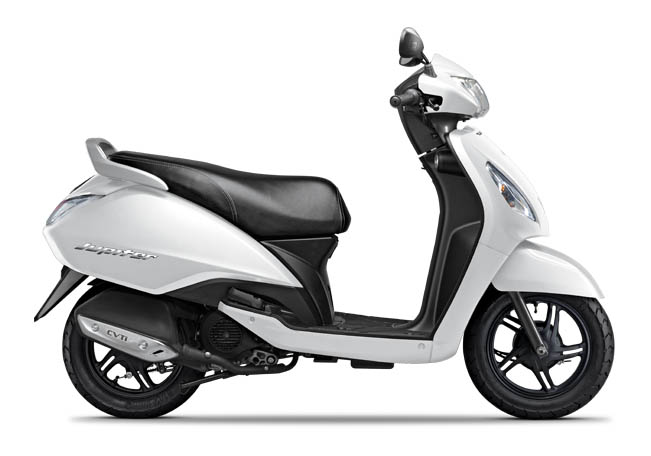 Viscous Paper Filter, Low Fuel Indication , Retractable Bag Hooks, Premium 3D Emblem, Large comfortable Seat, Patented E-Z Center Stand, External Fuel fill, Least Turning Radius of 1910 mm, Twin City Lamps Large Under Seat Storage, Key Shutter Lock The kick-start Powerful 110CC CVT-i ENGINE Econometer helps you get more Power and maximize your mileage as per your choice and TVS Jupiter delivers the Best-in-Class Mileage of 62 kmpl Unique Pass-by Switch, First time in scooters. It ensures that your overtaking manoeuvres are easy and safe on the highways or no-horn zones Tubeless Tyres which are Durable, Stylish & Lightweight All Black Alloy Wheels. Superior Road Grip. Free of Rusting. Tubeless tyres provides tension-free long rides. IT has the 1275 mm largest leg space amongst all scooters. Ride comfortably and store more. It can easily carry a LPG cylinder in horizontal position on the foot board, which no other scooter in the market can Advance Telescopic Shock Absorber in the front. The cushioning effect is better and smoother when riding through potholes or bad roads Gas-filled rear shock absorber gives you and pillion an excellent seating comfort and protects you from hurting your back or shoulders while riding on bumpy roads 0 to 60 kmph : 7.2 sec | ||